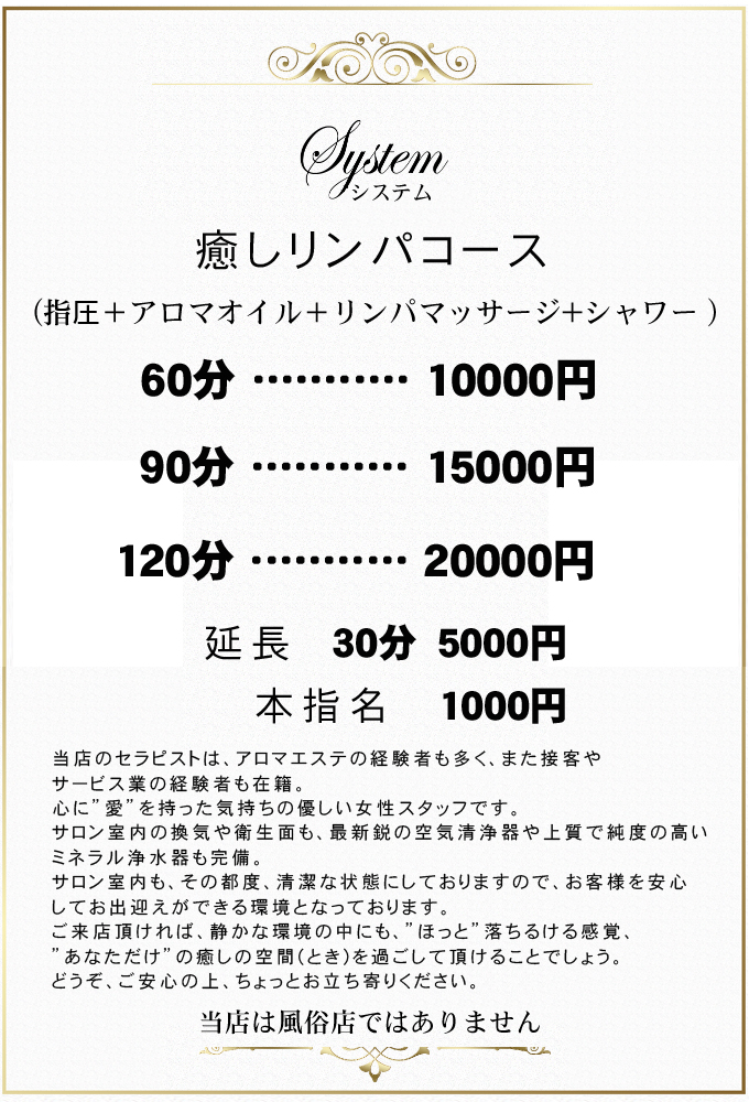 ハイレベルのセラピストだけ揃えて皆様の憩いの空間を演出いたします。今までのエステでは満足できない?なんか中途半端?と、不満を感じている方は是非一度当店をご利用下さい。